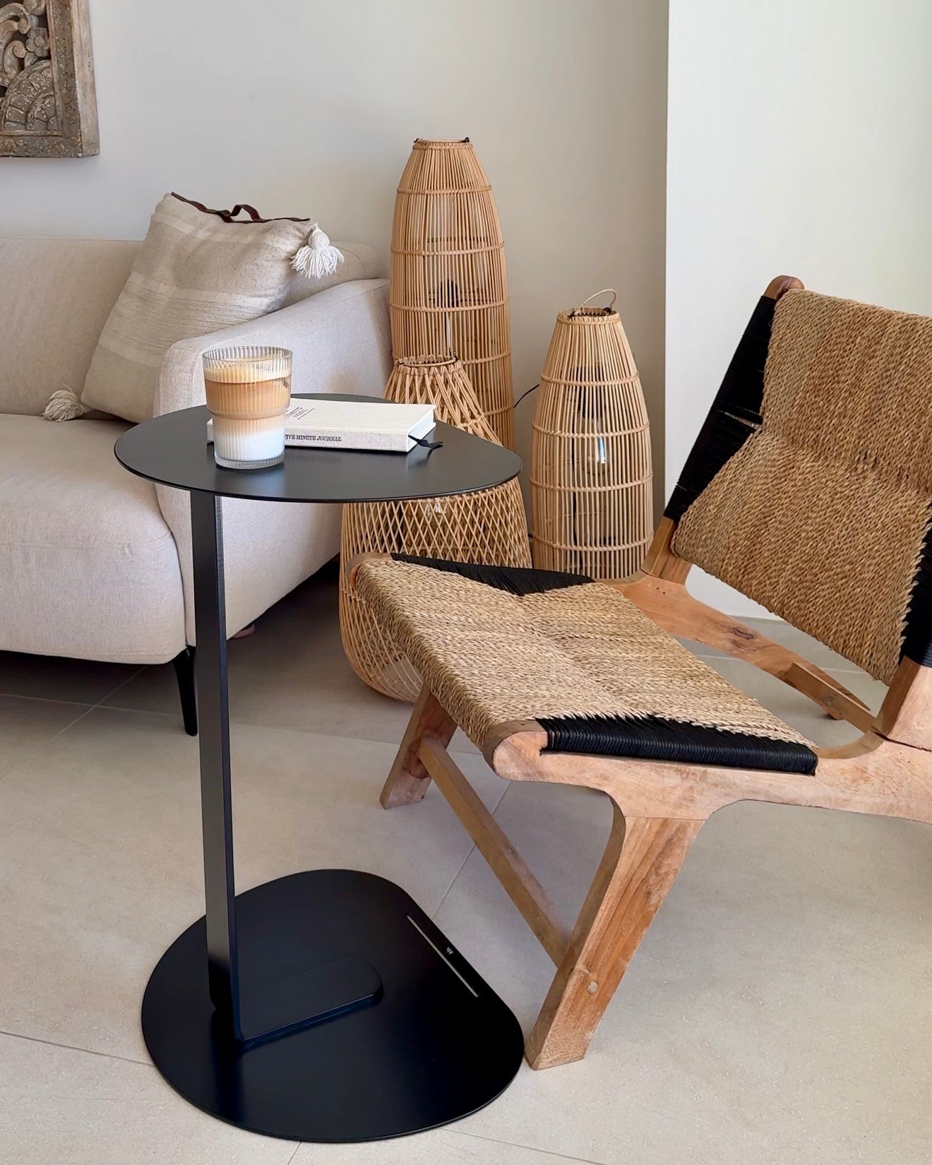 È stato progettato per essere posizionato sopra il bracciolo di un divano, fornendo una superficie stabile per bevande, libri o un computer portatile.