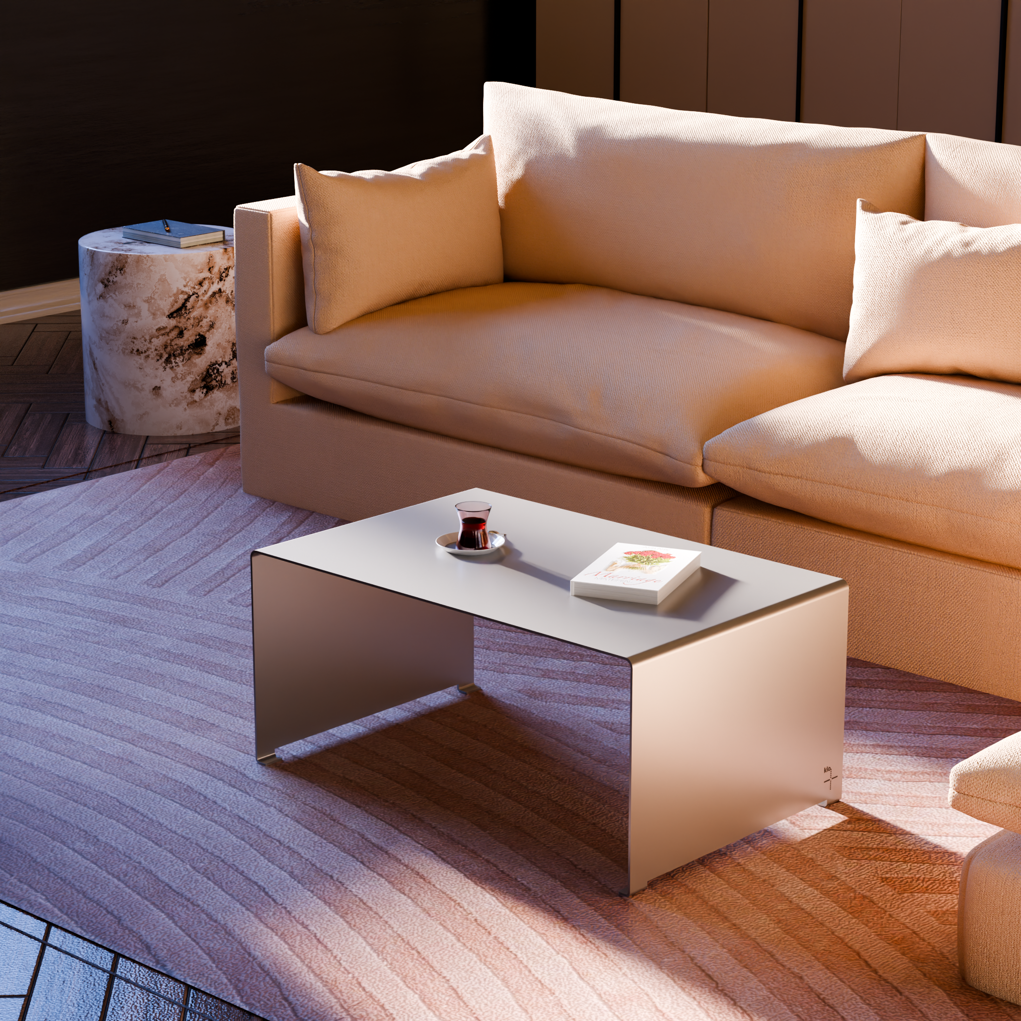 Originally designed for Cosmos Concept, this coffee table features a custom collaboration logo created exclusively for the project.